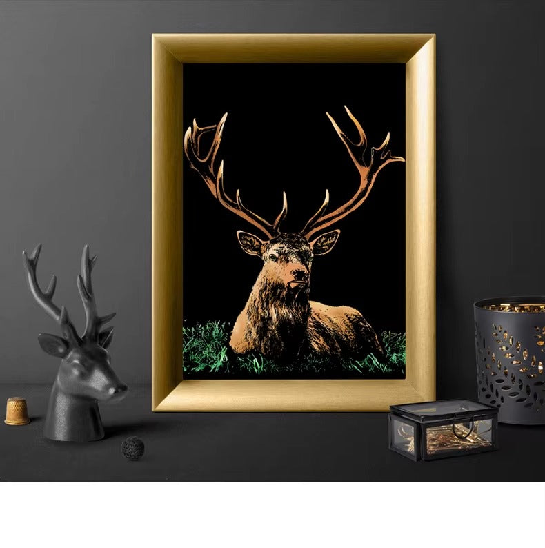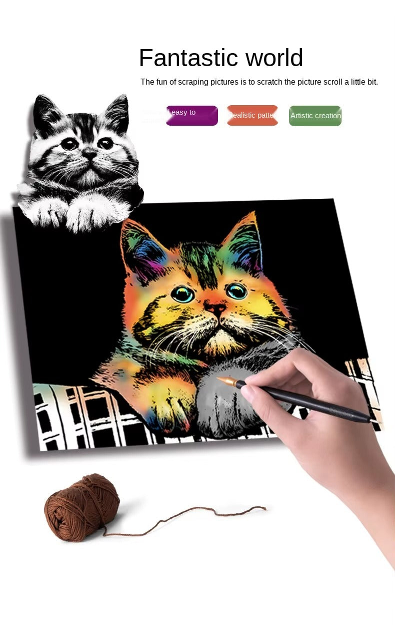 Cada lámina viene cubierta con una superficie negra que irás rascando con un punzón especial. A medida que lo haces, se revela una obra llena de color, profundidad y brillo sutil. El resultado: una escena nocturna deslumbrante que tú mismo diste vida.