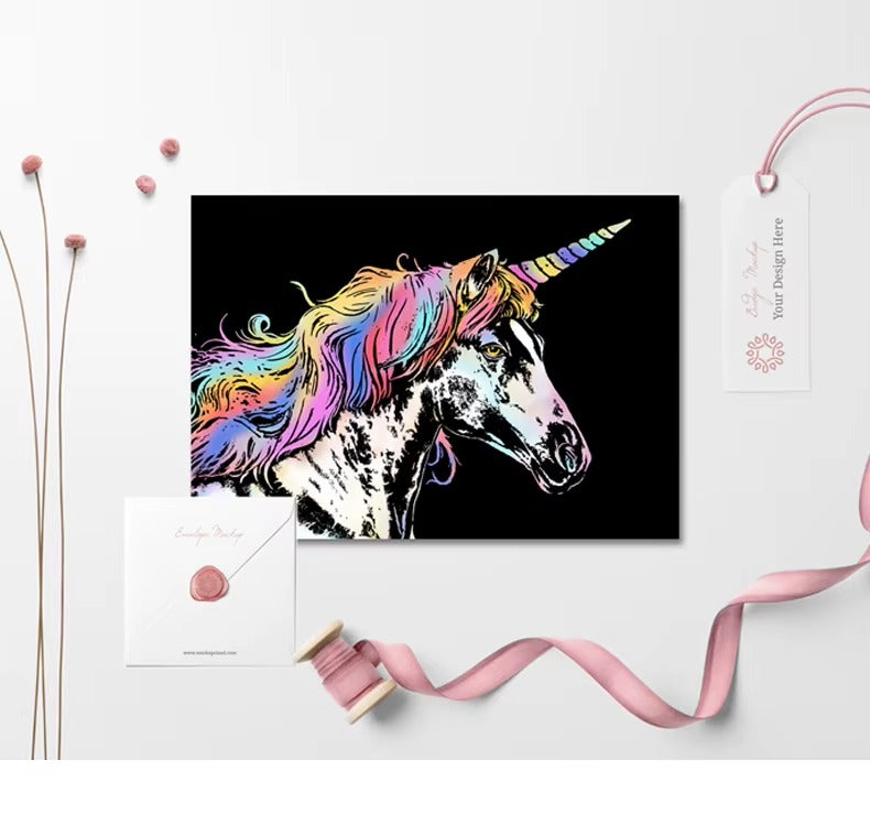 Cada set incluye 4 láminas con animales o escenas de fantasía, todas listas para ser reveladas con tus propias manos.